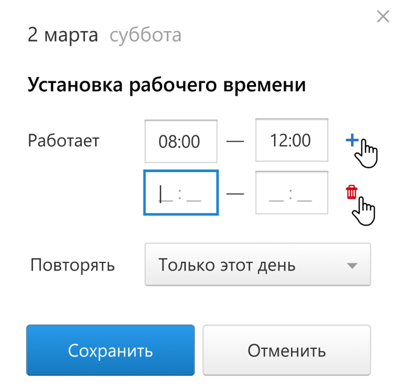 Чтобы создать новый период рабочего времени, кликните на «плюс». Период удалится, если нажать на корзинку.