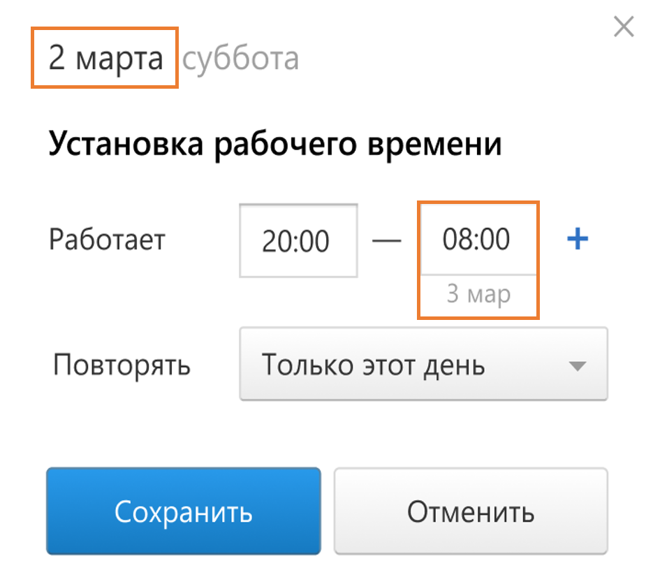 Больше вы не спутаете дневные и ночные смены сотрудников в графике и календаре. Сервис по времени окончания работы определит, когда заканчивается смена, и самостоятельно проставит дату следующего дня.