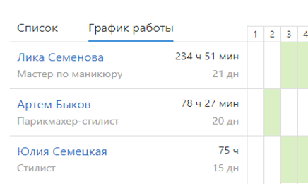 С помощью графика удобно записывать клиентов на оказание услуги конкретным мастером. Теперь в графике вы можете учитывать обеденные перерывы и добавлять ночные смены.