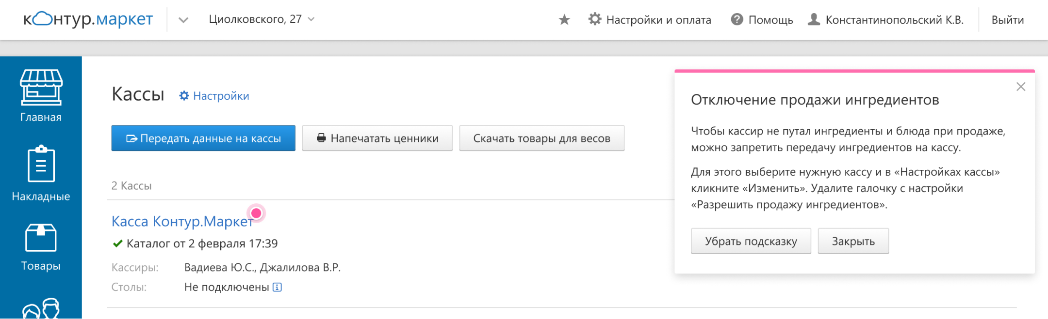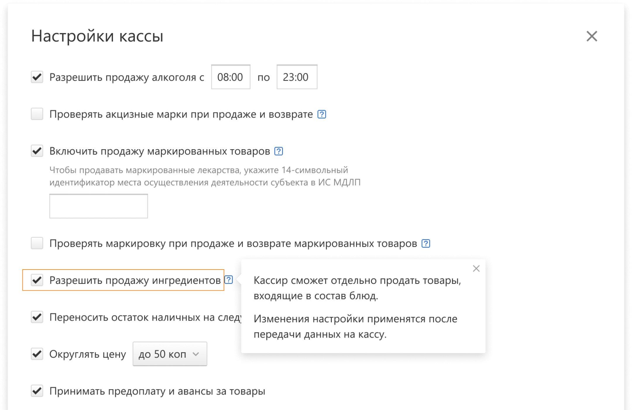 В Контур.Маркете поставьте галочку в настройках кассы. Это позволит запретить продажу ингредиентов, входящих в состав блюд, полуфабрикатов, заготовок.